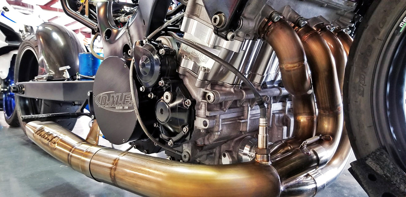 DME Racing’s Standard SS Motorcycle Exhaust system is a custom 1.75″ to 1.875″ diameter 4 into 1 big tube step header. This system is specifically designed for large engines, and all-out Grudge bikes (short-necked and D-raked). This system fits flush with the bottom case. Some bikes will require modifications to the radiator, see our fitment notes below.